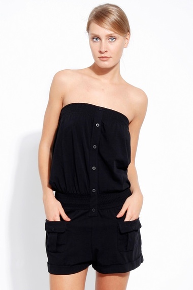 Черный женский комбинезон с шортами из хлопковой ткани.
