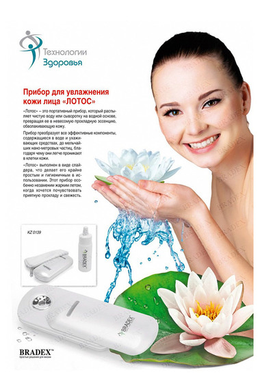 ОписаниеПрибор для увлажнения кожи лица «ЛОТОС» - незаменимая вещь в любом современном городе. В условиях жизни нынешних дней сухость кожи – одна из главных проблем, с которыми сталкивается современная женщина. С помощью данного прибора, созданного с помощью современных технологий, Вы сможете устроить себе спа-процедуру, не выходя из своего дома и не тратя денег на дорогостоящие салоны красоты.
